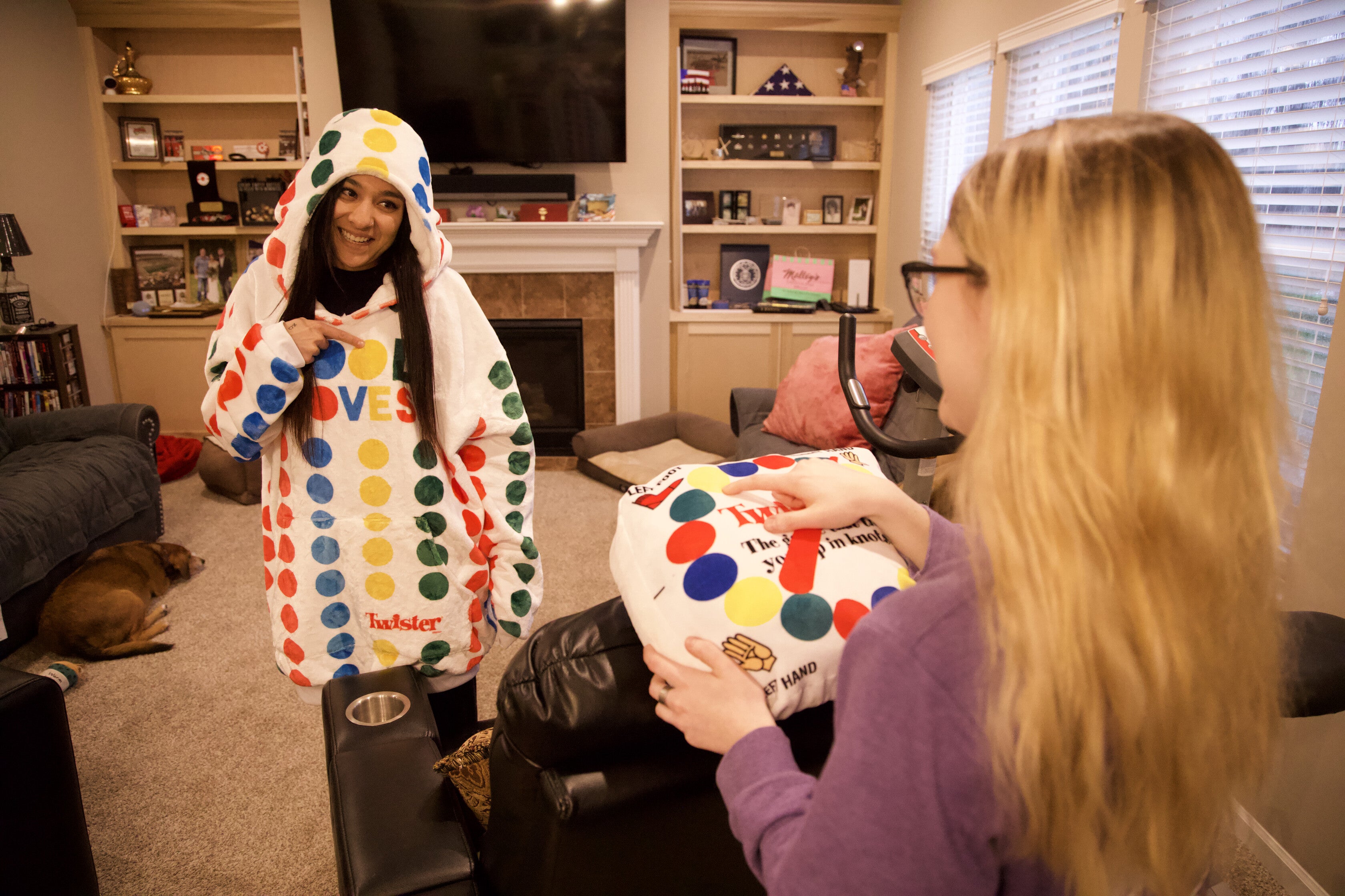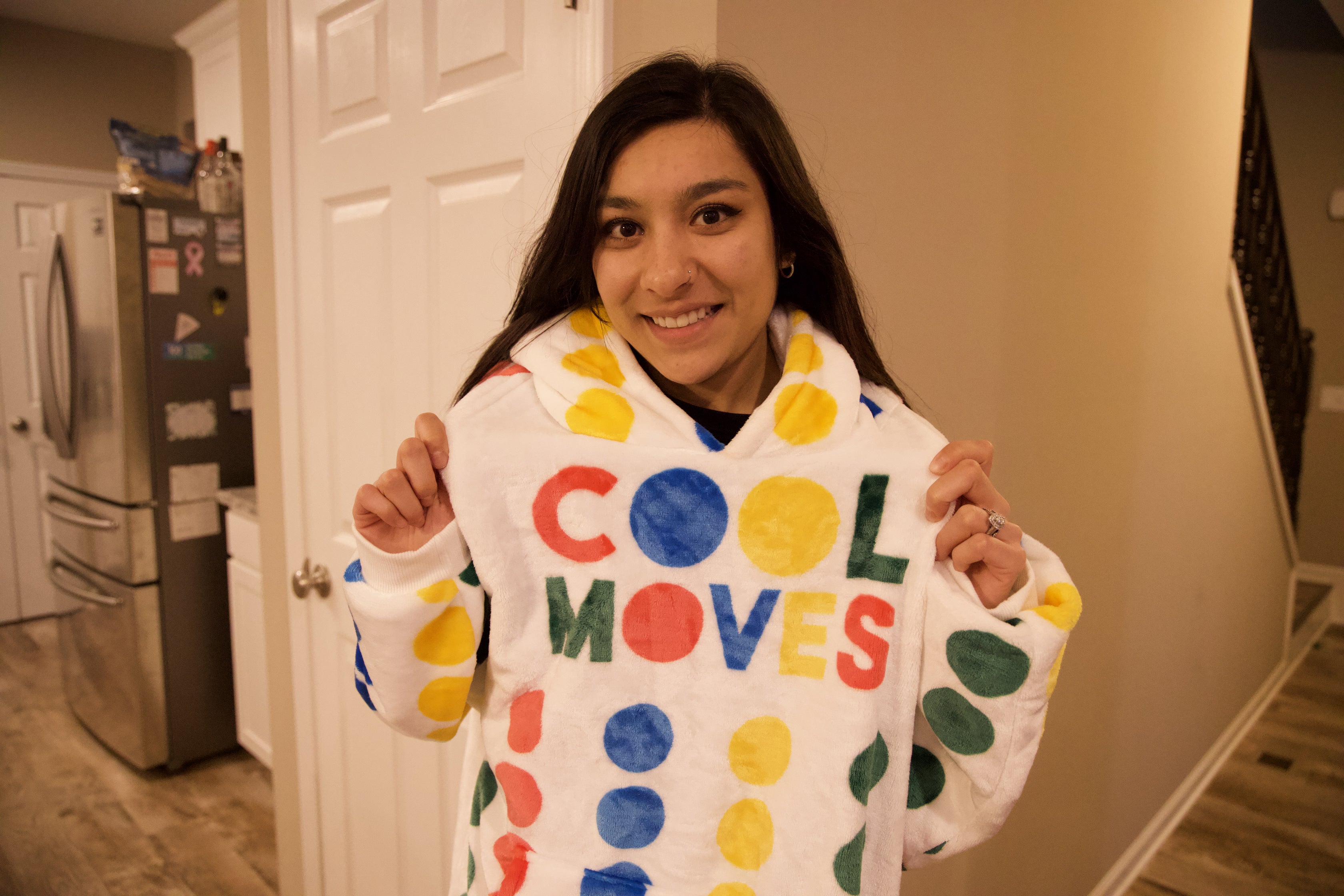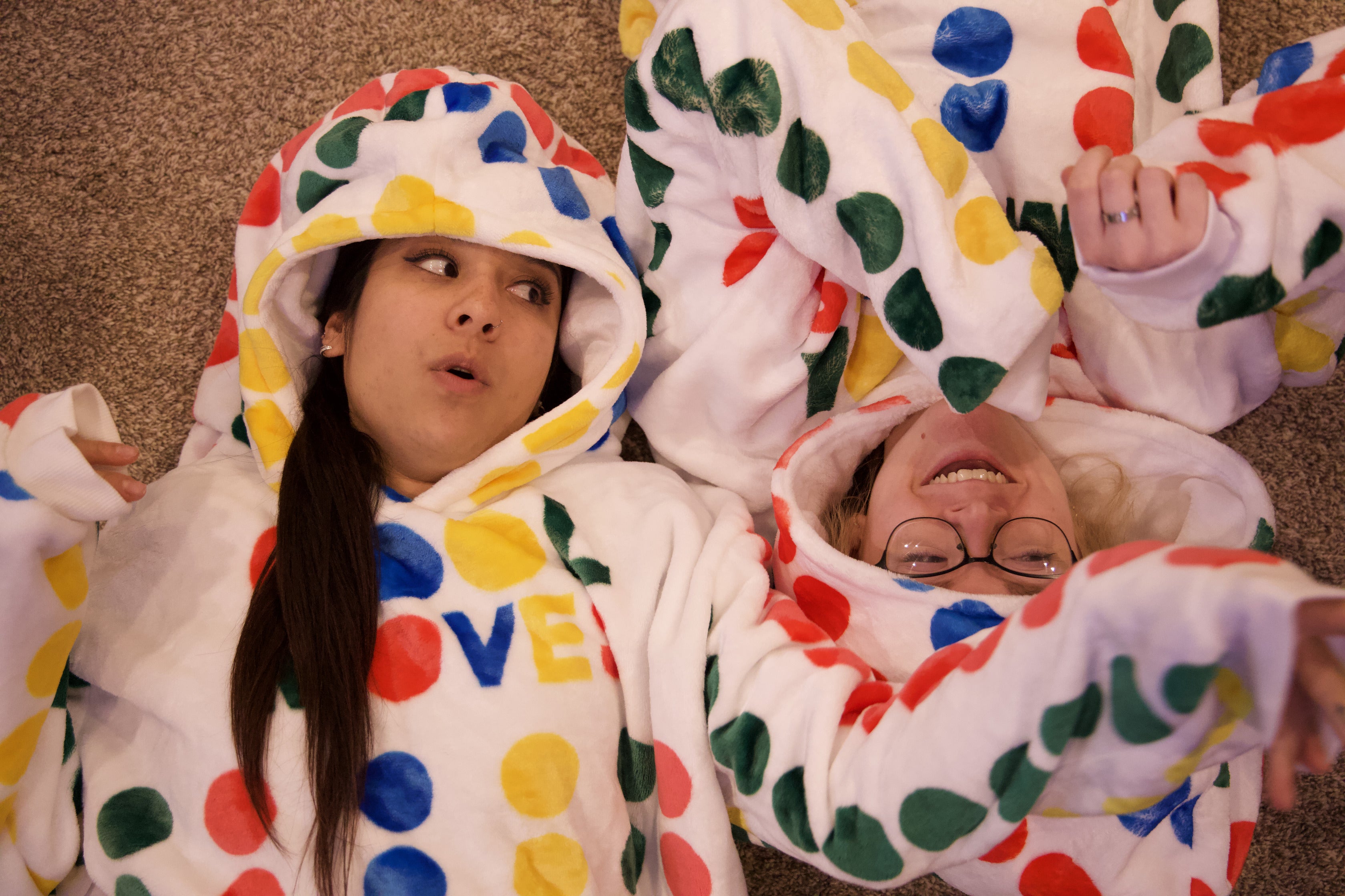 The Twister Snugible: the ultimate cozy companion for game nights! This versatile blanket hoodie combines comfort and fun. Its vibrant colors and playful design add a twist to lounging or movie marathons. Made with ultra-soft, high-quality fabric, it's your go-to for warmth and relaxation.
